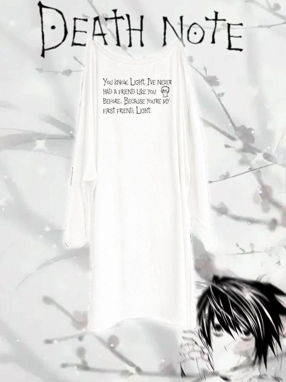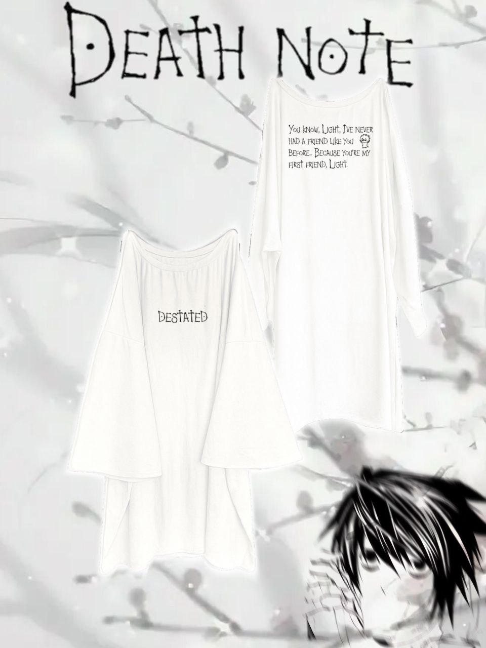 Оверсайз лонгслив с принтом Death Note. Надпись destated спереди, цитата L на спине.